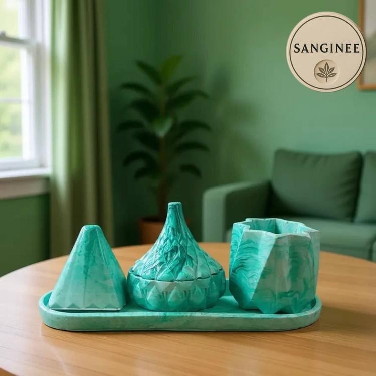 ست سینی، جاعودی، گلدان و جای اکسسوری ماربل سبز از سنگ مصنوعی دستساز؛ محصولی شیک، خاص و باکیفیت برای دکور میز و فضای داخلی. ترکیب طرح ماربل و رنگ سبز جذاب، این ست را به گزینهای ایدهآل برای نظمدهی و زیباسازی منزل تبدیل کرده است.