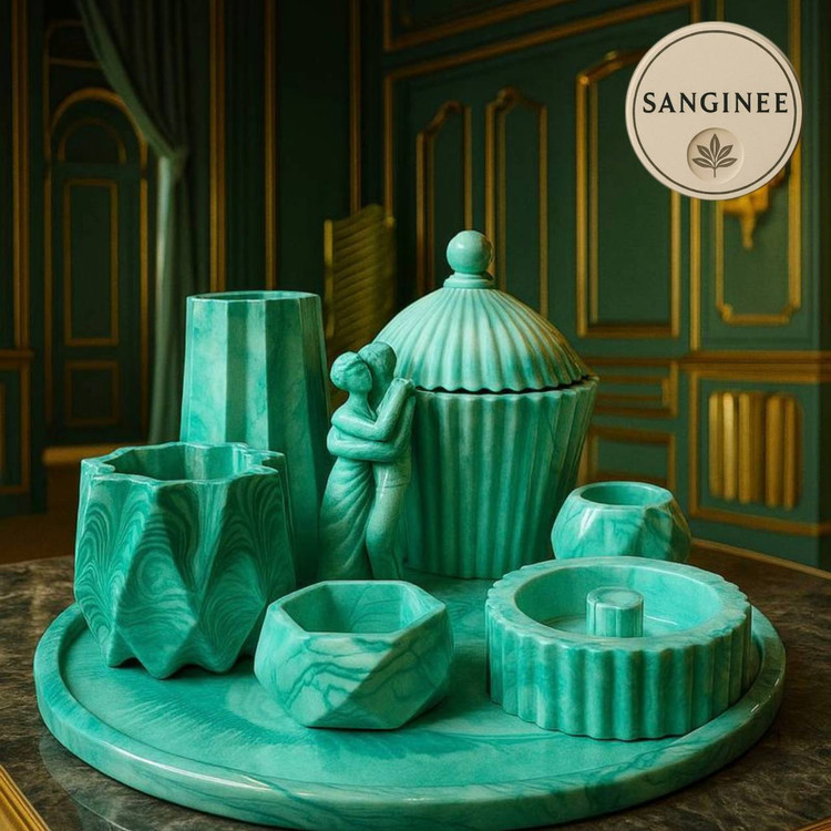 ست سنگ مصنوعی SANGINEE یک مجموعه لوکس و چشمنواز است که برای دکور مدرن و کلاسیک طراحی شده. این ست شامل سینی سنگی, جاکاردنی, گلدان کوچک, جاشمعی, ظرف دربدار, و زیرسیگاری سنگی است. طرح موجی و رنگ خاص سنگ مصنوعی، جلوهای متفاوت به میز پذیرایی، کنسول یا فضای نشیمن میدهد.